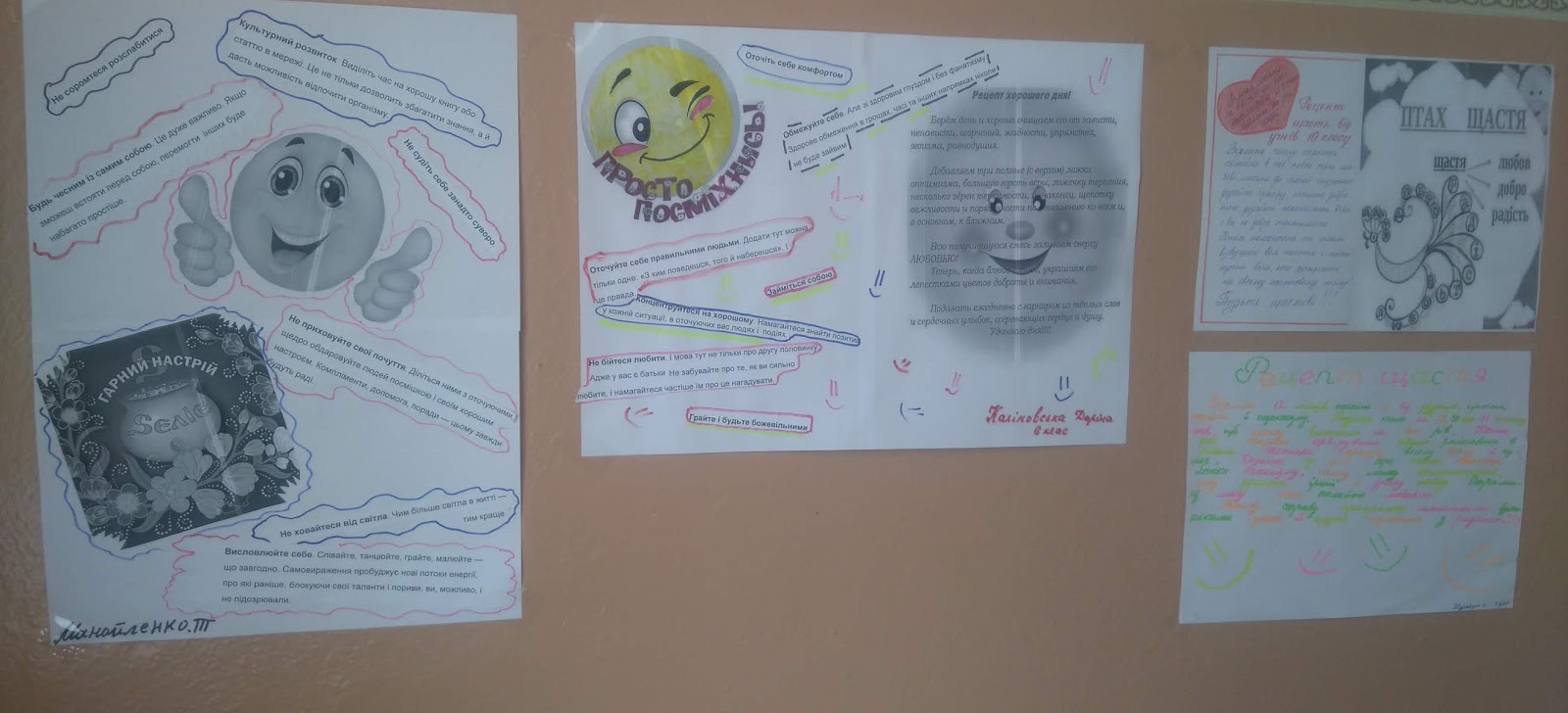 Учні 5-10 класів ділилися рецептами гарного настрою та щастя. У всіх були присутні такі складові як посмішка, позитивні емоції, любов та толерантність.
